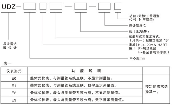 示例:UDZ-800HE1-2.5-180N 说明:导波雷达液位计,中心距800mm,4-20mA HART输出,整体式仪表与测量管 系统直联,显示测量值,设计压力2.5MPa,设计温度180℃,防腐型。 |